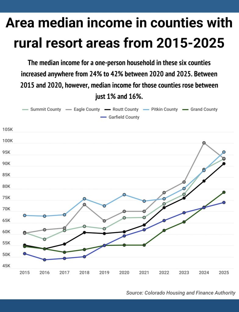 Since the COVID-19 pandemic, resort areas have seen erratic swings in their median income figures, which officials say is likely due to the migration of wealthier remote workers who flocked to mountain towns during the early years of the pandemic. Yet housing advocates aren’t seeing those income figures reflected in their workforce.