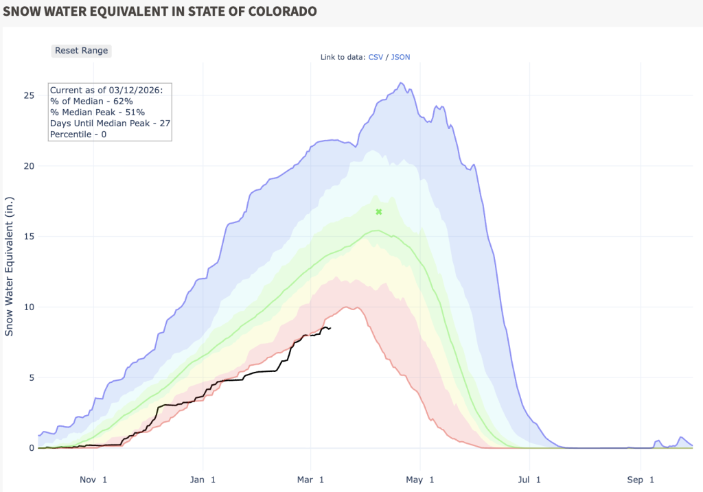 This winter’s lack of snow is the most severe since the snowpack telemetry began tracking data in the 1980s, with less than 30 days to go until the median peak for Colorado’s snowpack.