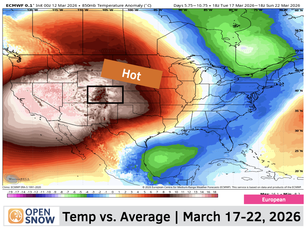 In a Wednesday report, OpenSnow Meteorologist Sam Collentine said the upcoming dry temperatures are “extremely warm for mid-March,” especially for mountains in the 10,000 to 11,000 foot range.