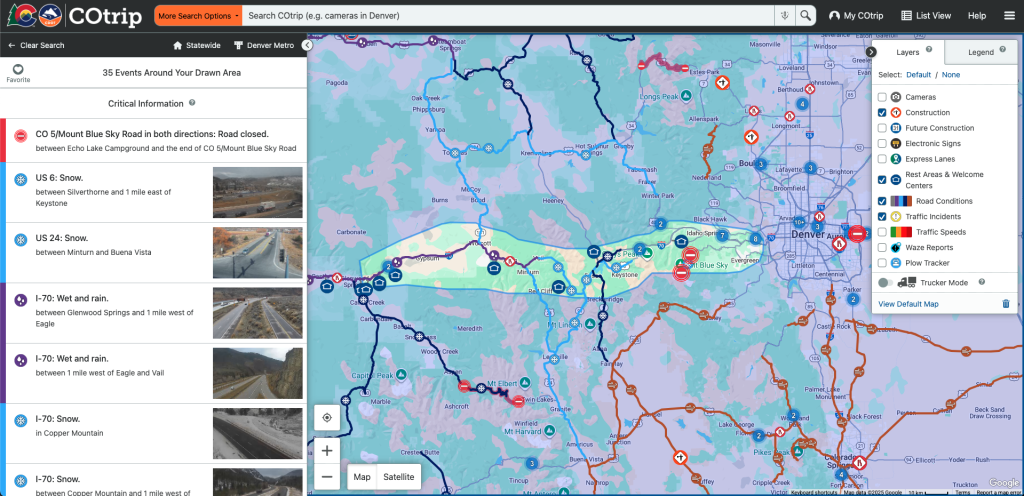That’s why COTrip is the best way for drivers to stay up to date on any road closures and any official detour routes in the event of a closure. Other mapping services, such as Google Maps or Apple Maps, may not contain accurate information about detours or closures, as they are not updated directly by state transportation officials.