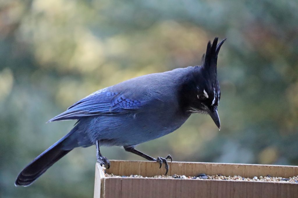 All About Birds describes Steller’s jays as blue-and-black songbirds that have a “prominent triangular crest” on their head.