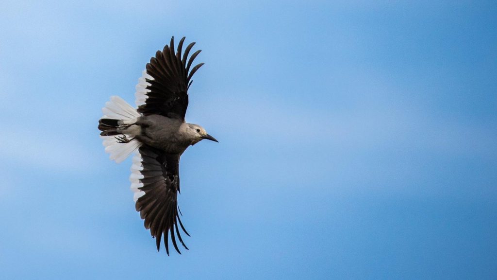 All About Birds describes Clark’s nutcrackers as gray-and-black birds that “swoop among wizened pine trees, flashing white in the tail and wing.”