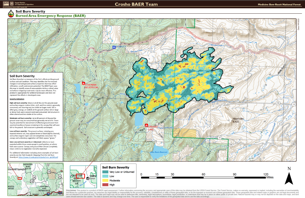 A fire intensity map created by the Forest Service’s Burned Area Emergency Response team shows that the Crosho Fire burned with very little intensity, with the majority of the soil indicating low-intensity burns.