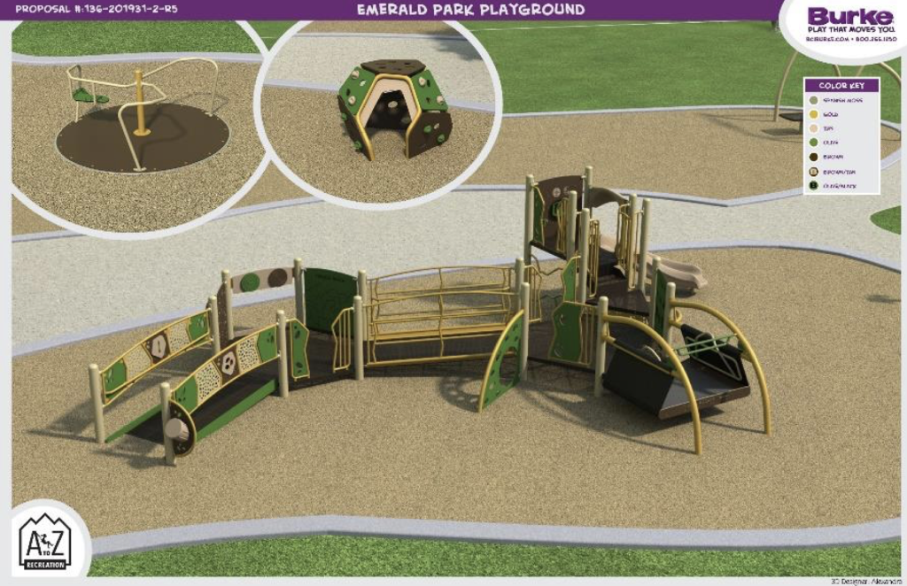 Plans call for two age-specific play structures, a 60-foot zipline, swings, a spinner, digital play riders, benches, shaded picnic tables, boulder seating and new sidewalks. The redesign also includes native landscaping, a rubberized play surface, drainage improvements and a water-efficient irrigation system.