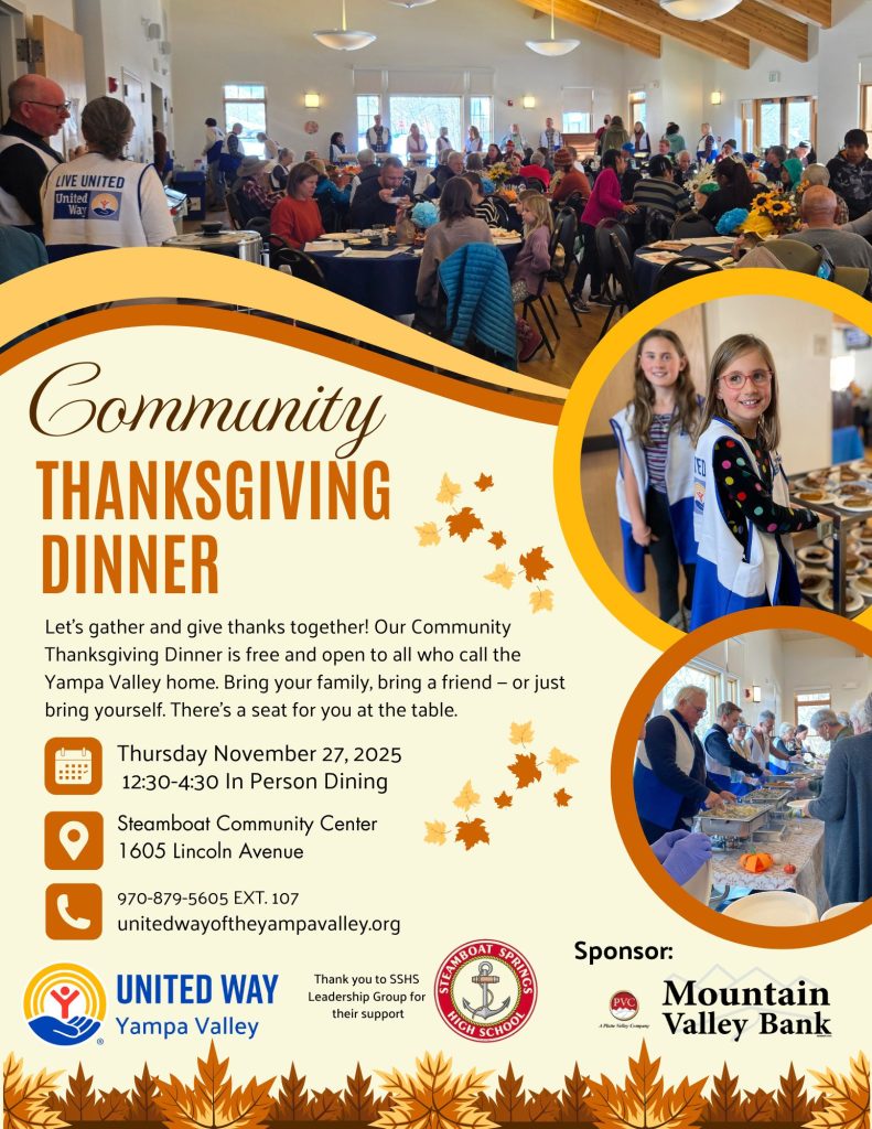 The annual free community Thanksgiving Dinner hosted by nonprofit United Way of the Yampa Valley is set for 12:30-4:30 p.m. Nov. 27 at the Steamboat Springs Community Center, 1605 Lincoln Ave.