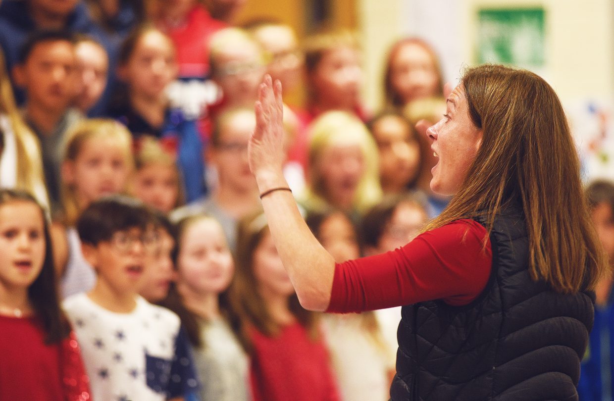Strawberry Park Elementary School music teacher Corinne Sommerfeld leads her students in a music-filled program honoring the Routt County men and women who have served our country. (Photo by John F. Russell)