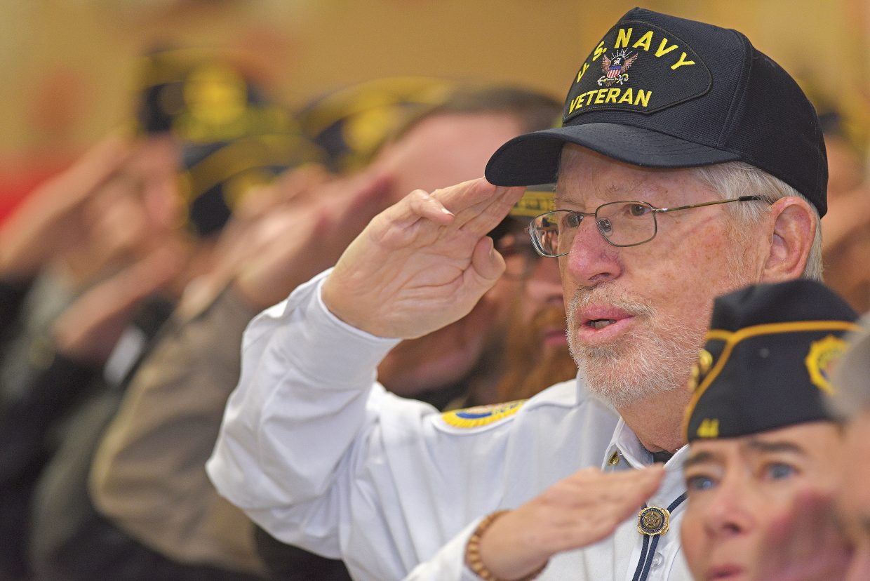 Gary Arentz, who served with the U.S. Navy as a quartermaster second class, salutes the American flag during a Veterans Day ceremony Monday morning at Strawberry Park Elementary School. The program, which was put on by the students of the school, honored local veterans and their service to the country. Veterans Day is celebrated annually on Nov. 11, the anniversary of the end of World War I. (Photo by John F. Russell)