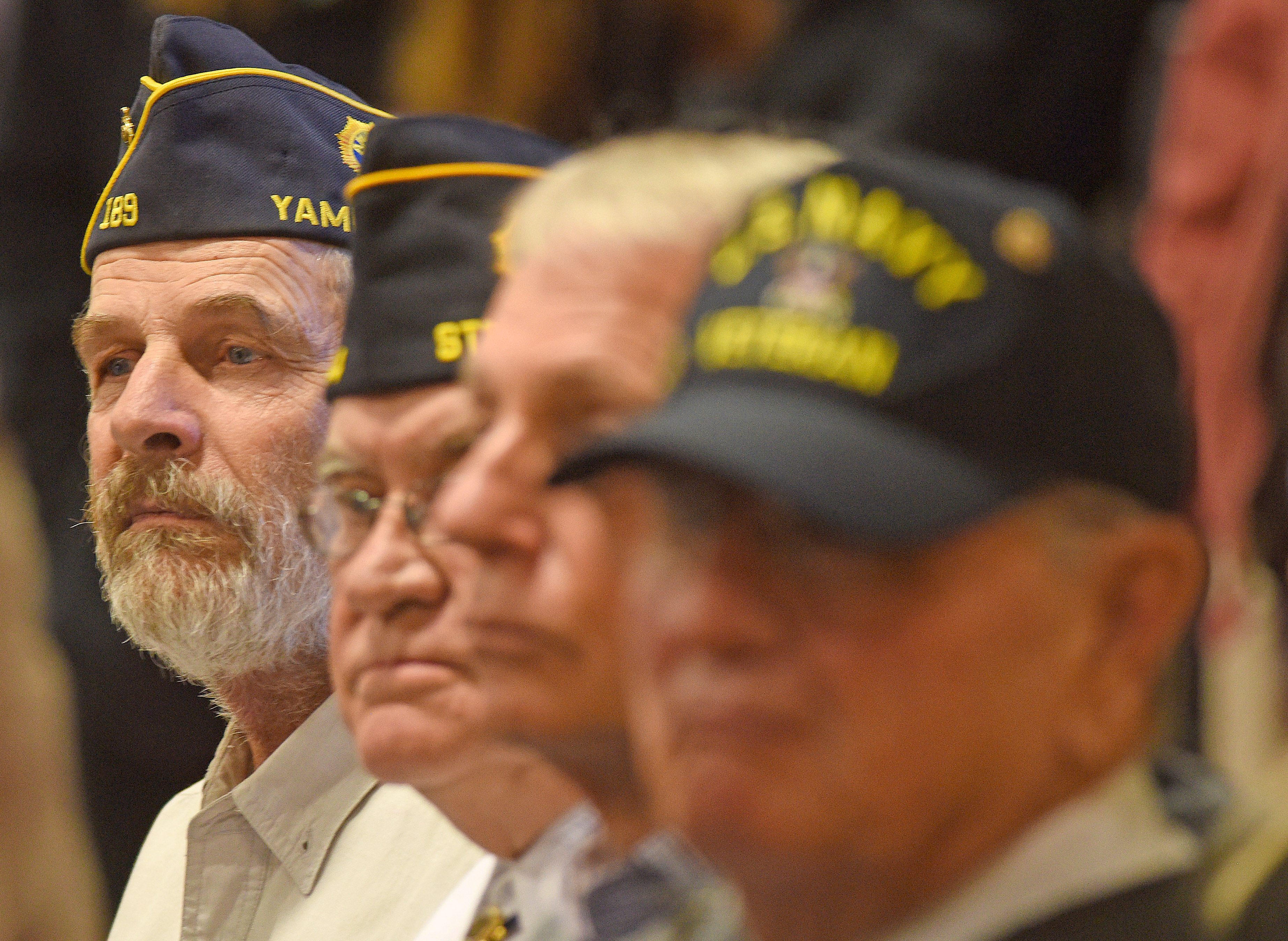 Retired Cpl. John Bergstrom, who served with the U.S. Marine Corps, listens as young students at Strawberry Park Elementary School honor veterans during a ceremony Monday. (Photo by John F. Russell)