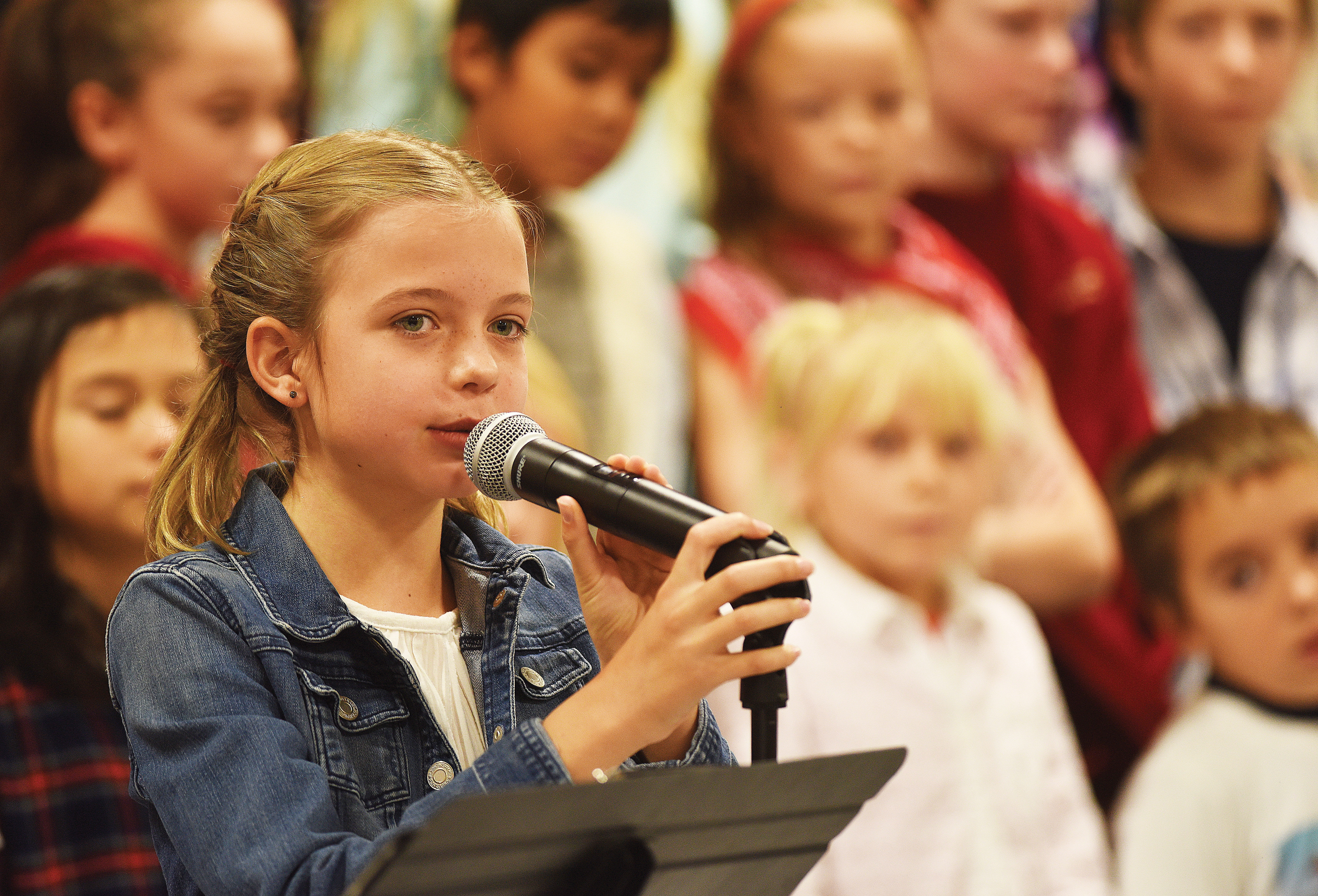 Student Anja Honebein reads a passage during Strawberry Park Elementary School’s Veterans Day ceremony Monday in Steamboat Springs. (Photo by John F. Russell)