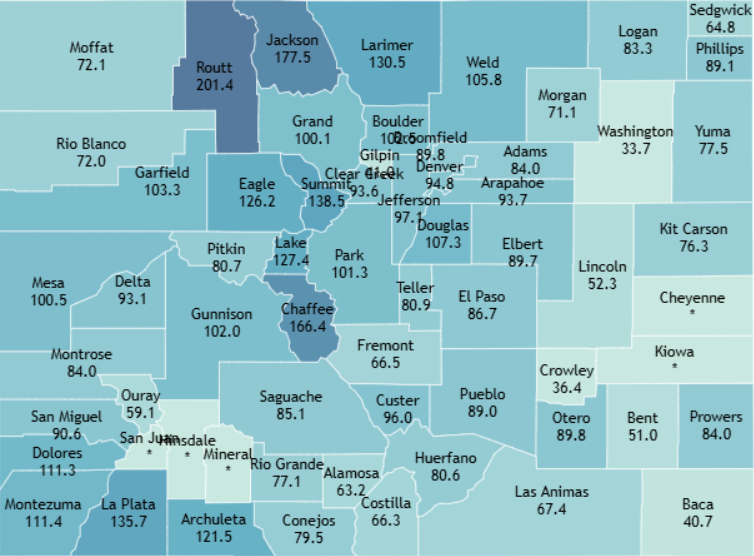 Using a statistical comparison rate of 100,000 men to rank the incidence rates accurately between smaller and larger counties, Routt had the highest incidence rate of 201.4 per 100,000 men during 2020-22, compared to the statewide rate of 98.2 per 100,000 during the same three-year period. The most recent year of data available from the Colorado Central Cancer Registry is 2022.