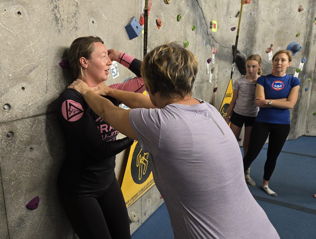 The class is taught by Lindsay Heideman, a blue belt and student of Brazilian jiu-jitsu, which is a self-defense martial art and combat sport based on grappling, ground fighting and submission holds. The class helps women learn how to use leverage and momentum to their advantage to protect themselves and get away from a threatening situation.